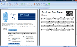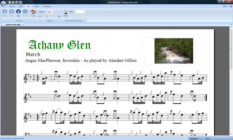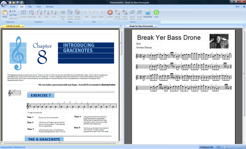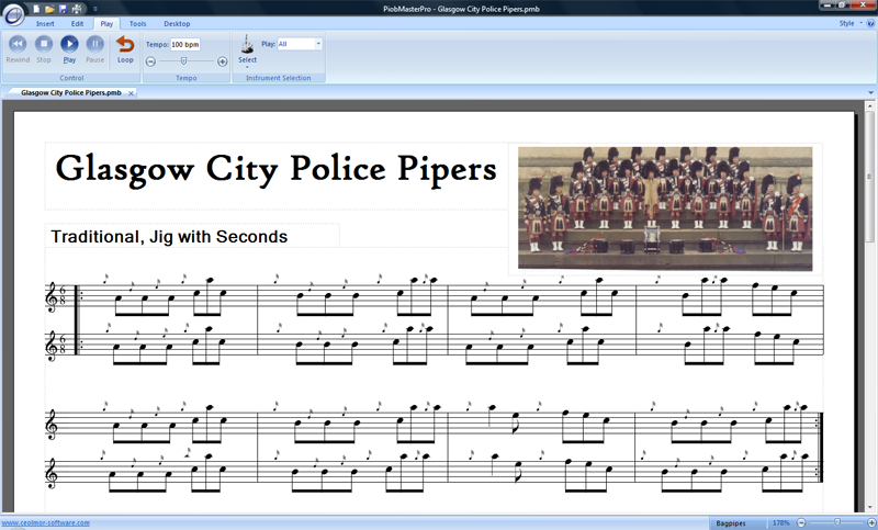 PiobMasterPro has been designed from scratch. As well as including all the standard PiobMaster 2.3 functionality, PiobMasterPro has been updated with a modern MS Office 2010 look & feel. It is as much a music book publishing piece of software, as it is a pipe music writing program. This means that music tutor books can be reproduced where every phrase or exercise on the page comes to life with the ability for them to be played back. Checkout the example page from the National Piping Centre Tutorbook opposite.